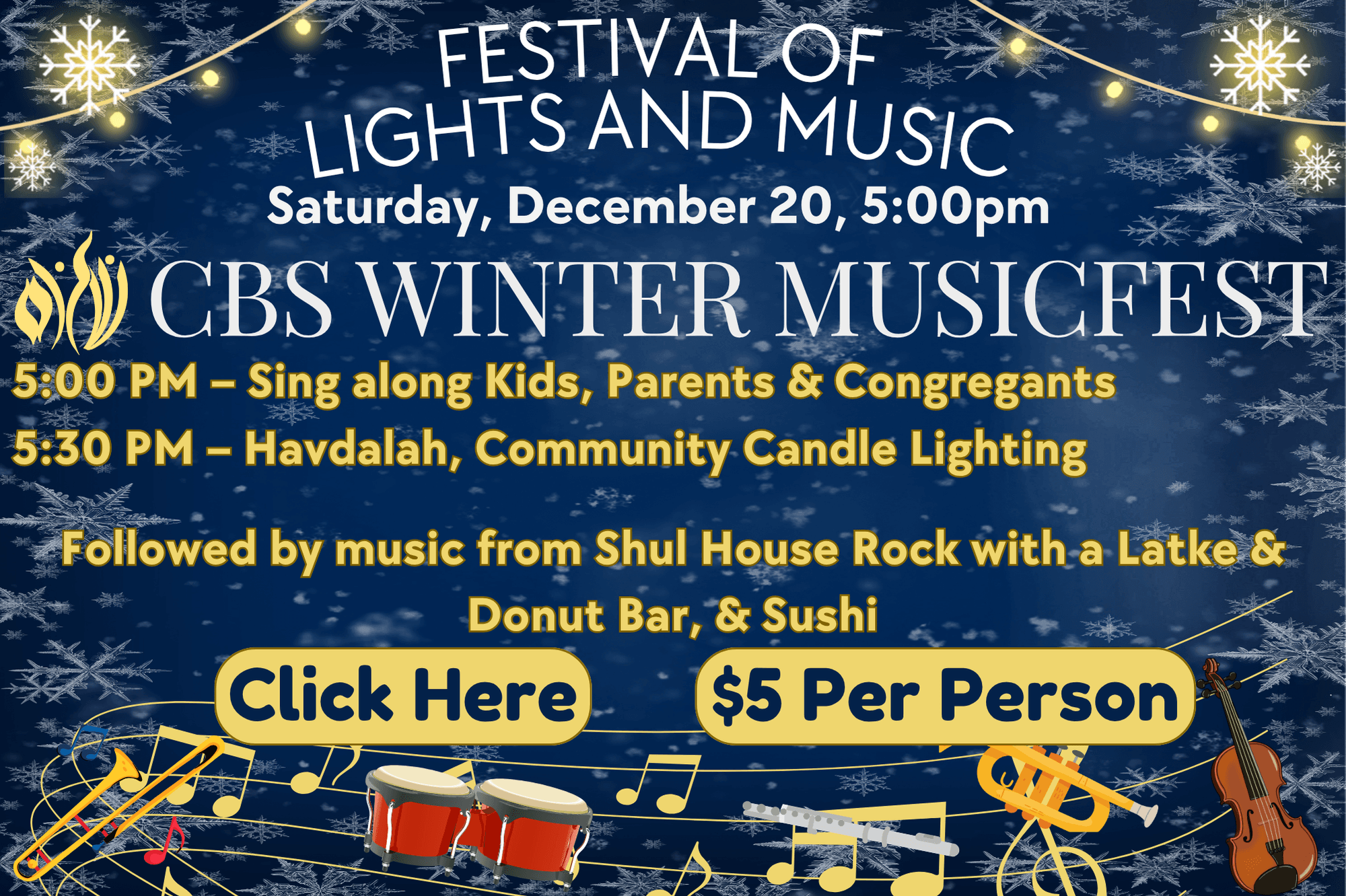 Followed by music from Shul House Rock with a Latke & Donut Bar, & Sushi