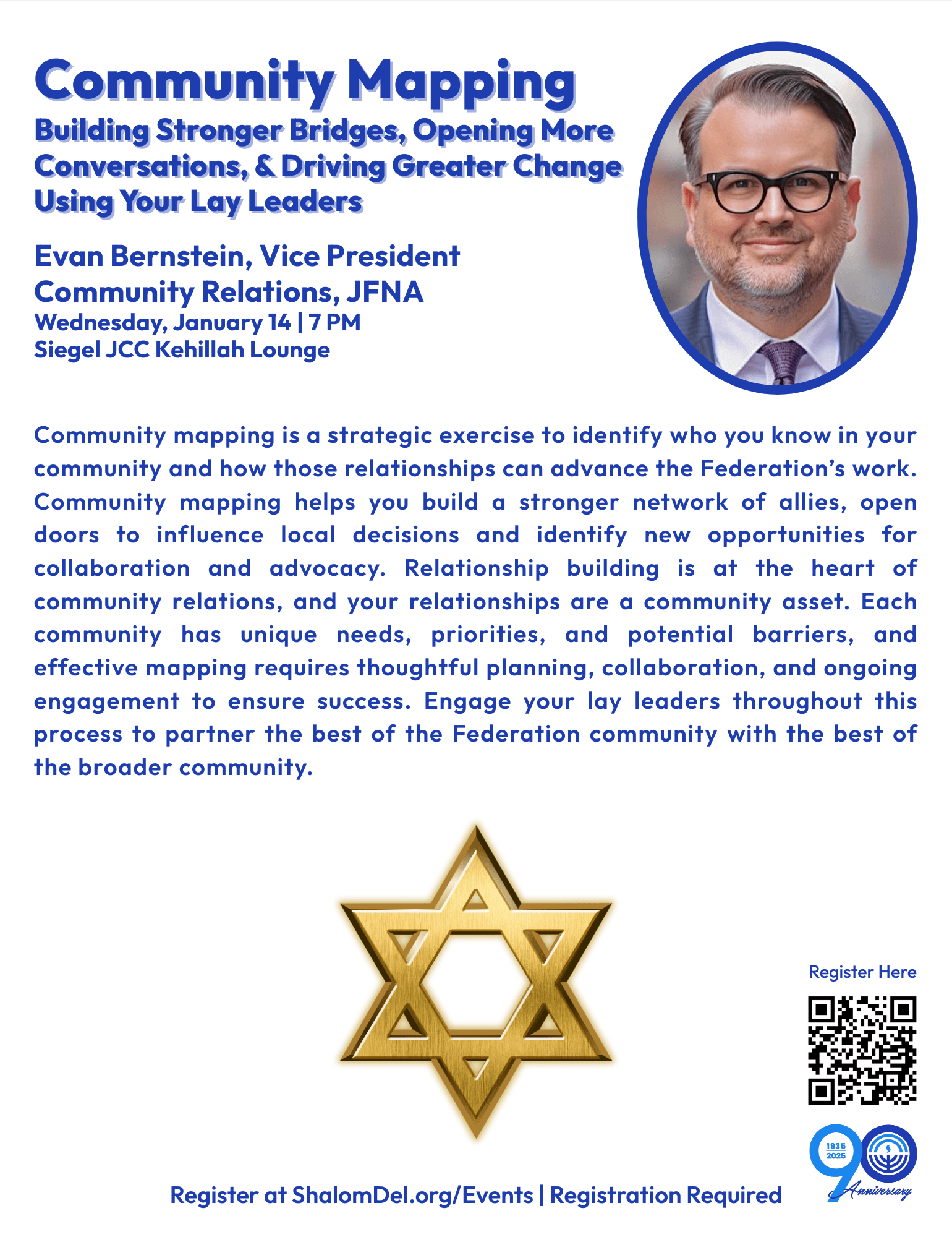 Community mapping is a strategic exercise to identify who you know in your community and how those relationships can advance the Federation’s work. Community mapping helps you build a stronger network of allies, open doors to influence local decisions and identify new opportunities for collaboration and advocacy. Relationship building is at the heart of community relations, and your relationships are a community asset. Each community has unique needs, priorities, and potential barriers, and effective mapping requires thoughtful planning, collaboration, and ongoing engagement to ensure success. Engage your lay leaders throughout this process to partner the best of the Federation community with the best of the broader community.