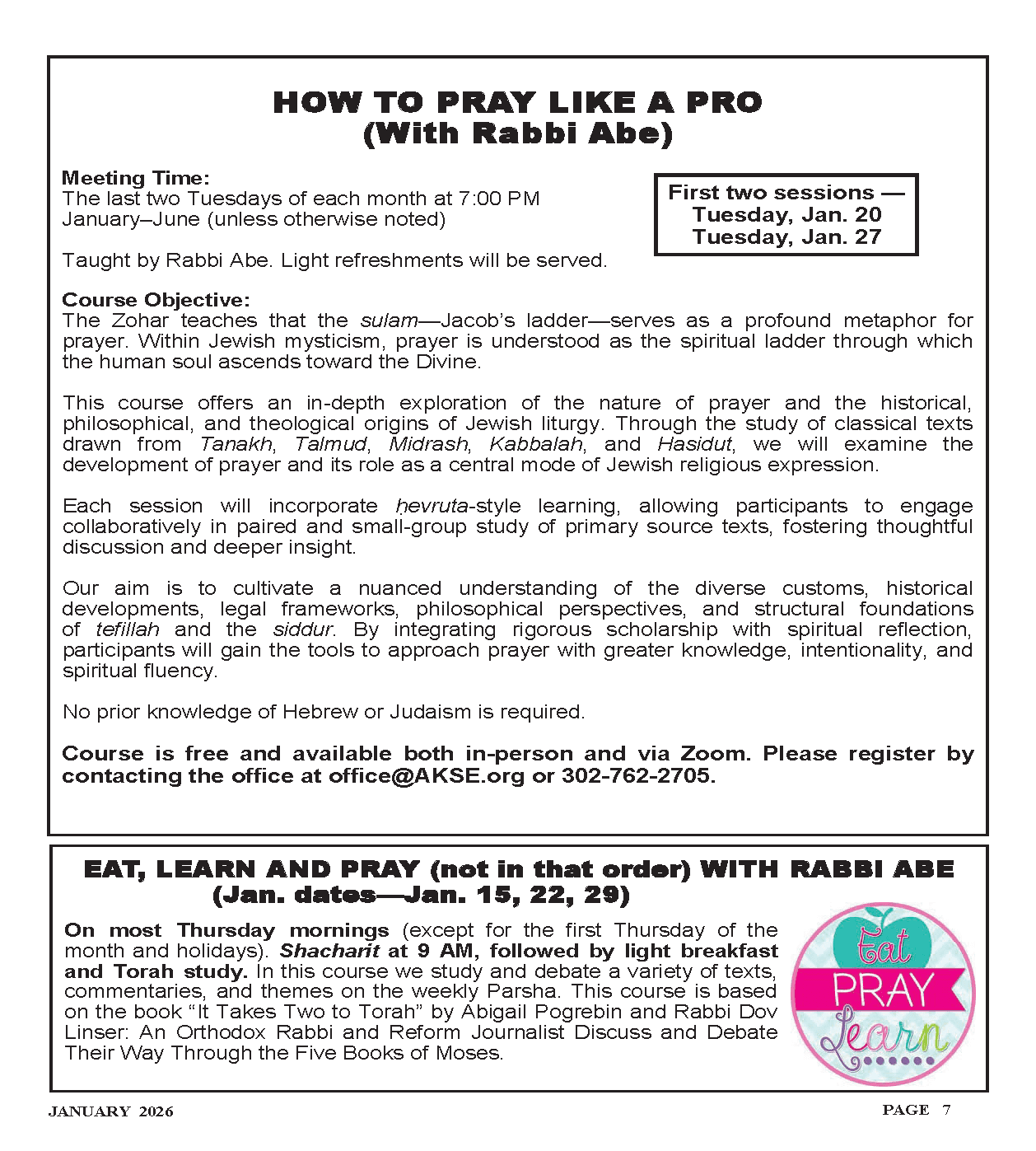 Course is free and available both in-person and via Zoom. Please register by contacting the office at office@AKSE.org or 302-762-2705.