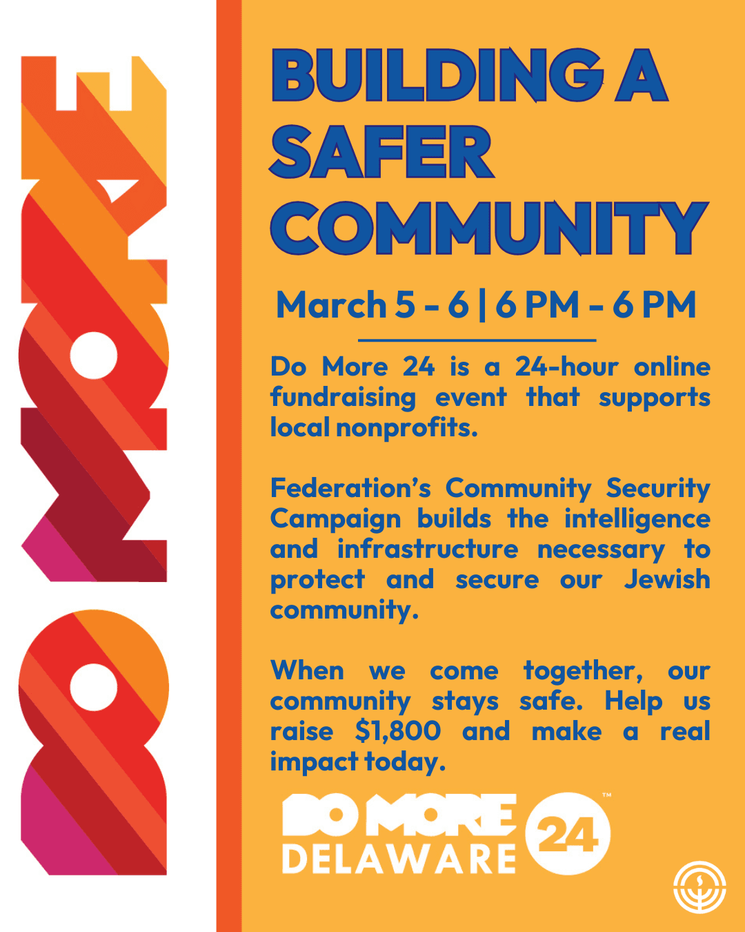 Do More 24 is a 24-hour online fundraising event that supports local nonprofits. Federation’s Community Security Campaign builds the intelligence and infrastructure necessary to protect and secure our Jewish community.